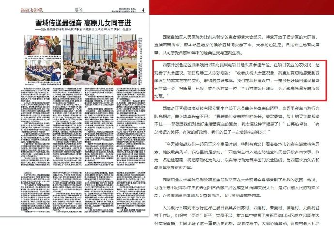 ?。冈?2日,西藏開投色尼區(qū)曲果嘎姆200兆瓦風(fēng)電項(xiàng)目組織各參建單位干部職工、在項(xiàng)目就業(yè)的農(nóng)牧民一起觀看西藏自治區(qū)成立60周年慶祝大會(huì)盛況的消息,被中國(guó)西藏網(wǎng)、西藏日?qǐng)?bào)、中國(guó)西藏新聞網(wǎng)、西藏法制報(bào)等各級(jí)媒體平臺(tái)宣傳報(bào)道。
